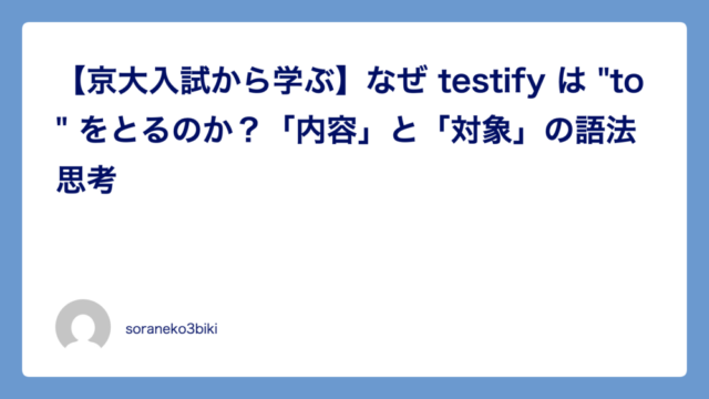 英語実況中継 【京大入試から学ぶ】なぜ testify は "to" をとるのか?「内容」と「対象」の語法思考 2026年3月6日 soraneko3biki こんにちは。 今日は、2026年度の京都大学・大問1(b)に出題された一文を題材に、 多くの学習者が丸暗記で済ませてしまいがち …